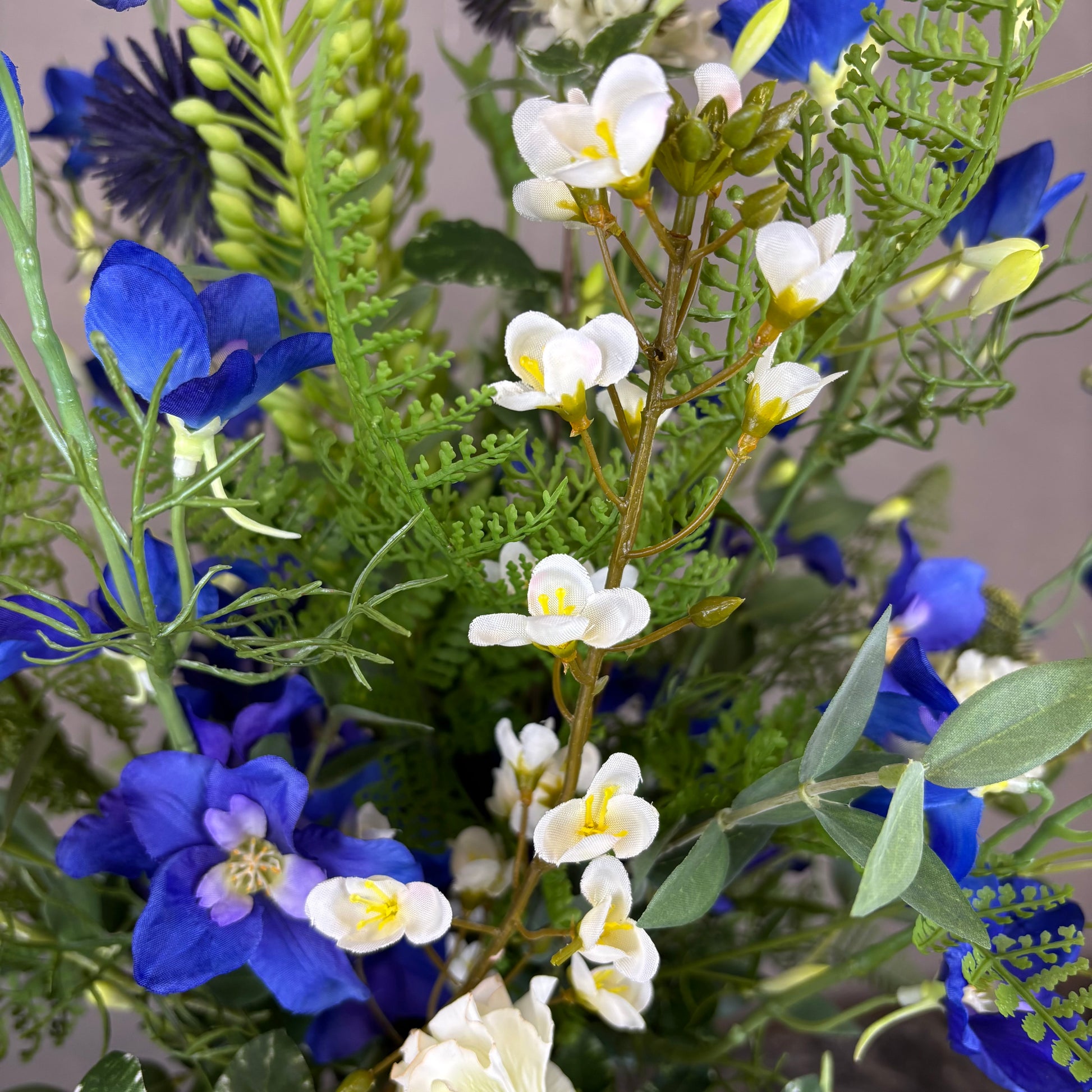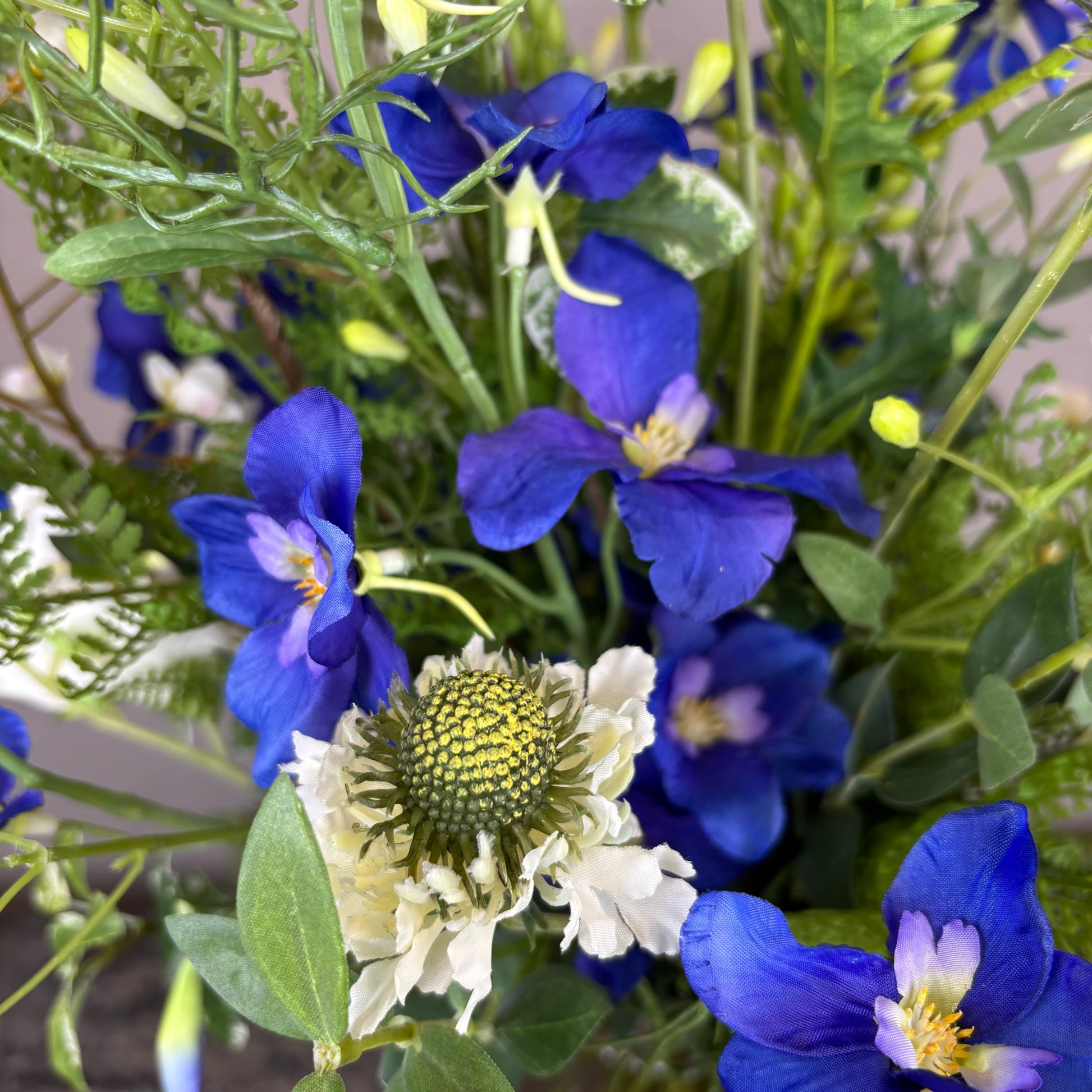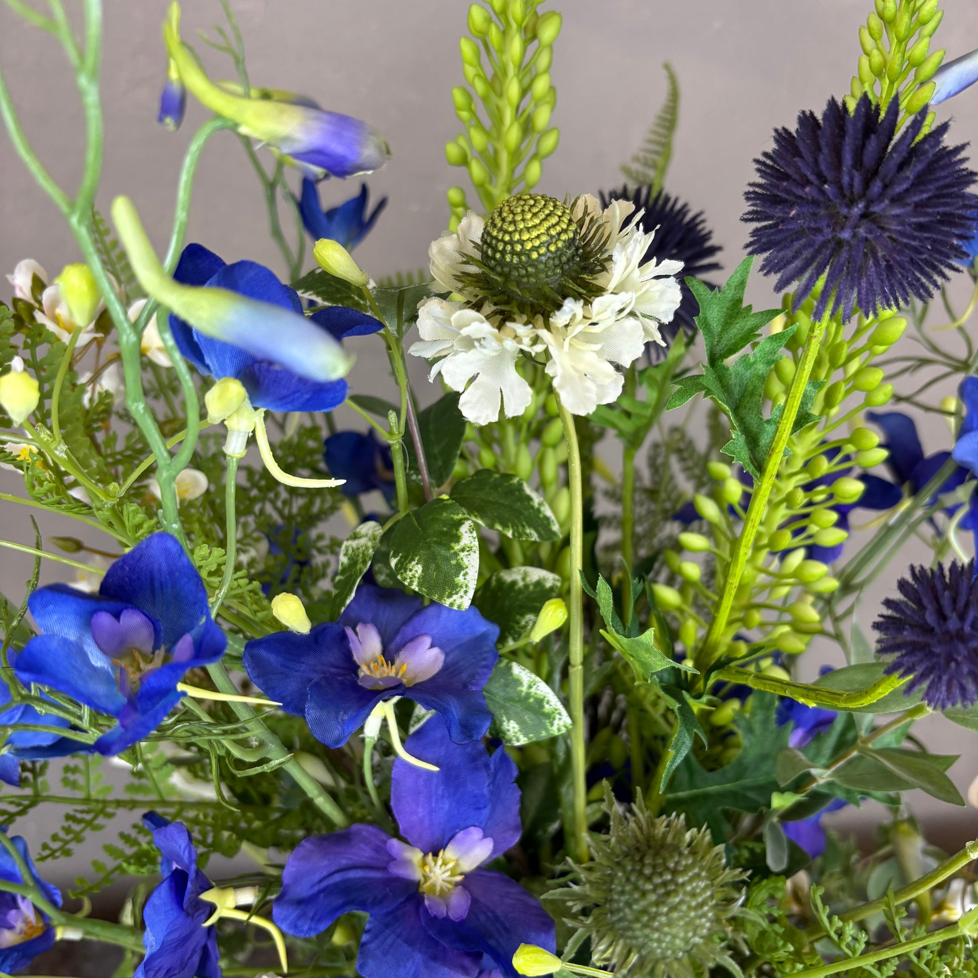 - Naturtro kunstig buket med bl.a. ridderspore, scabiosa og lathyrus