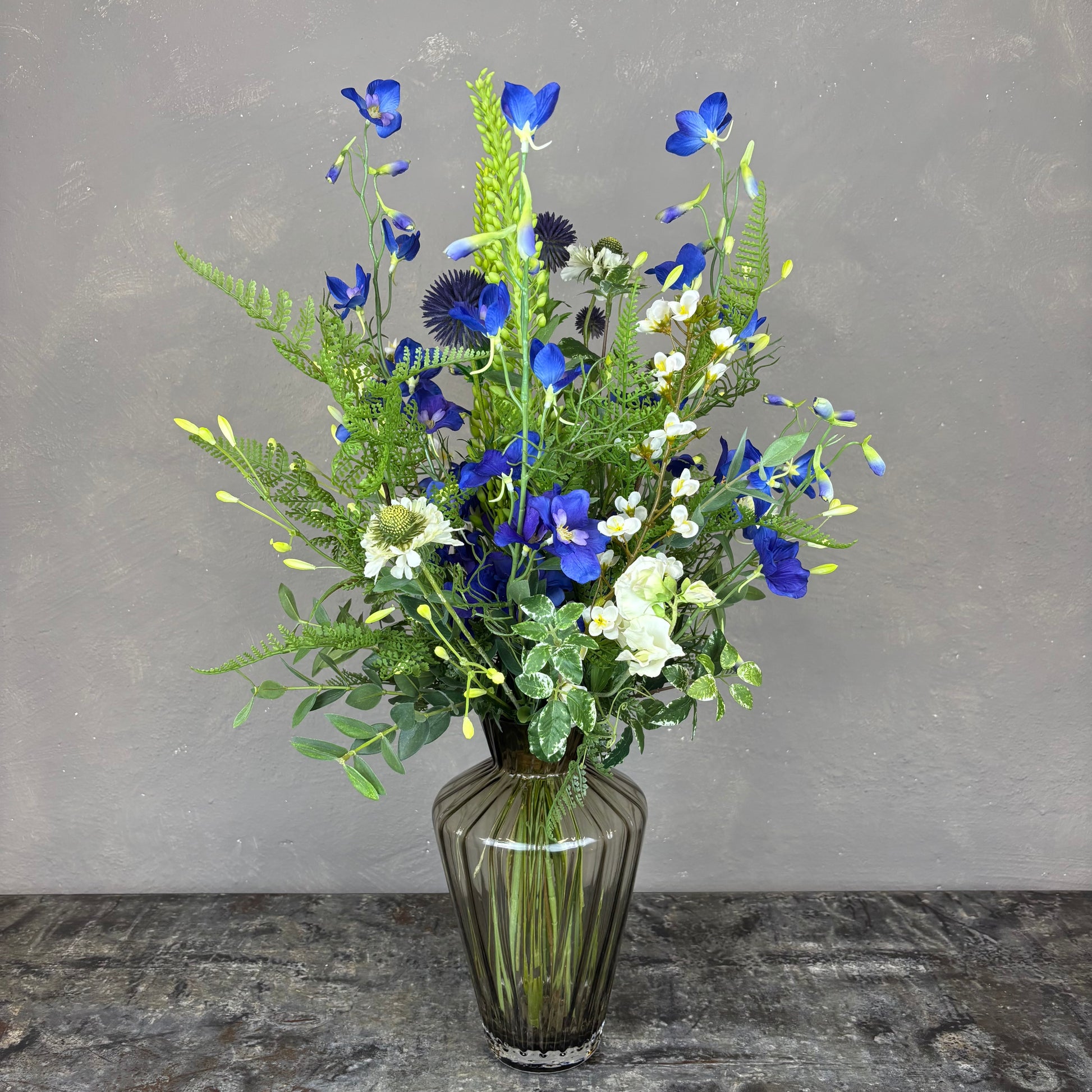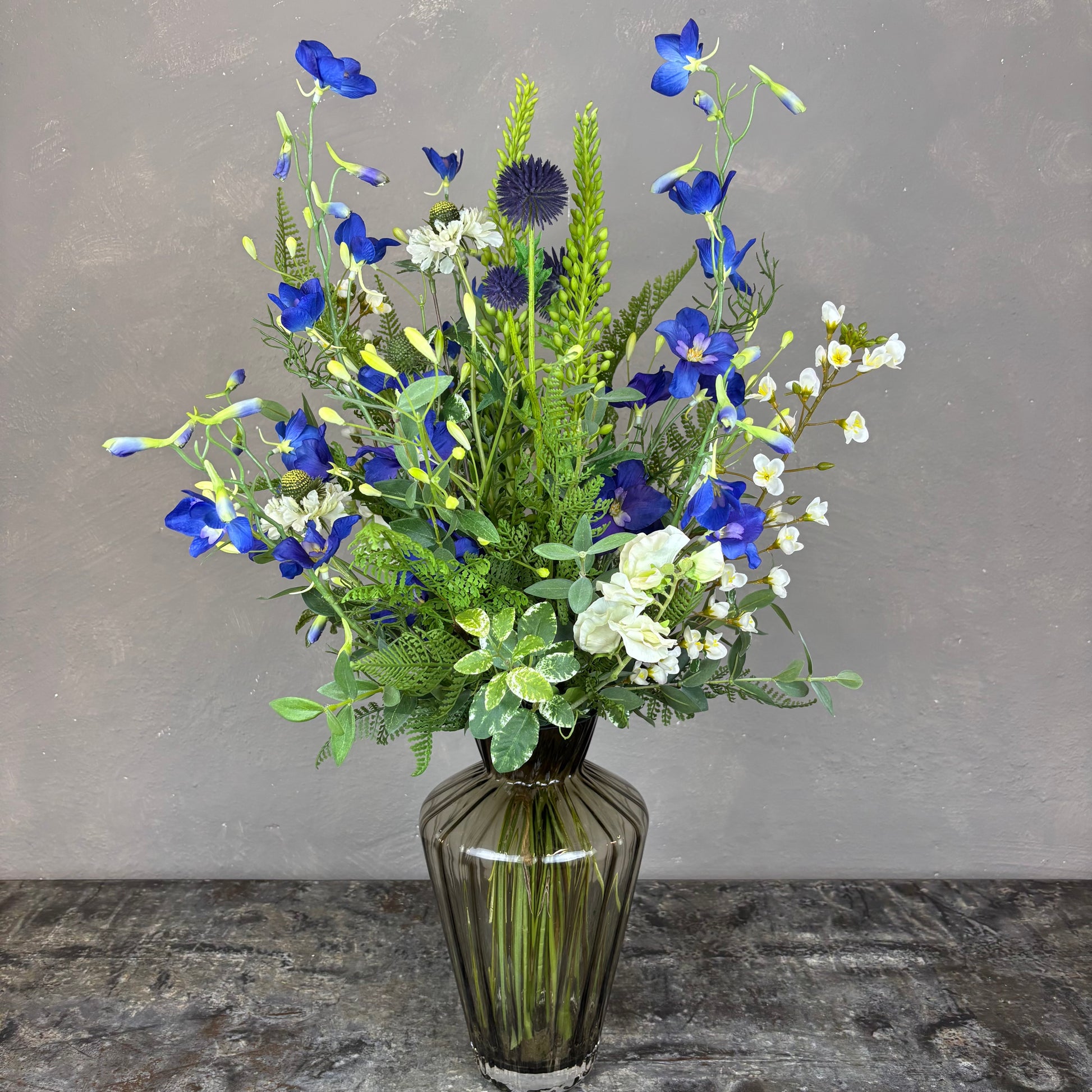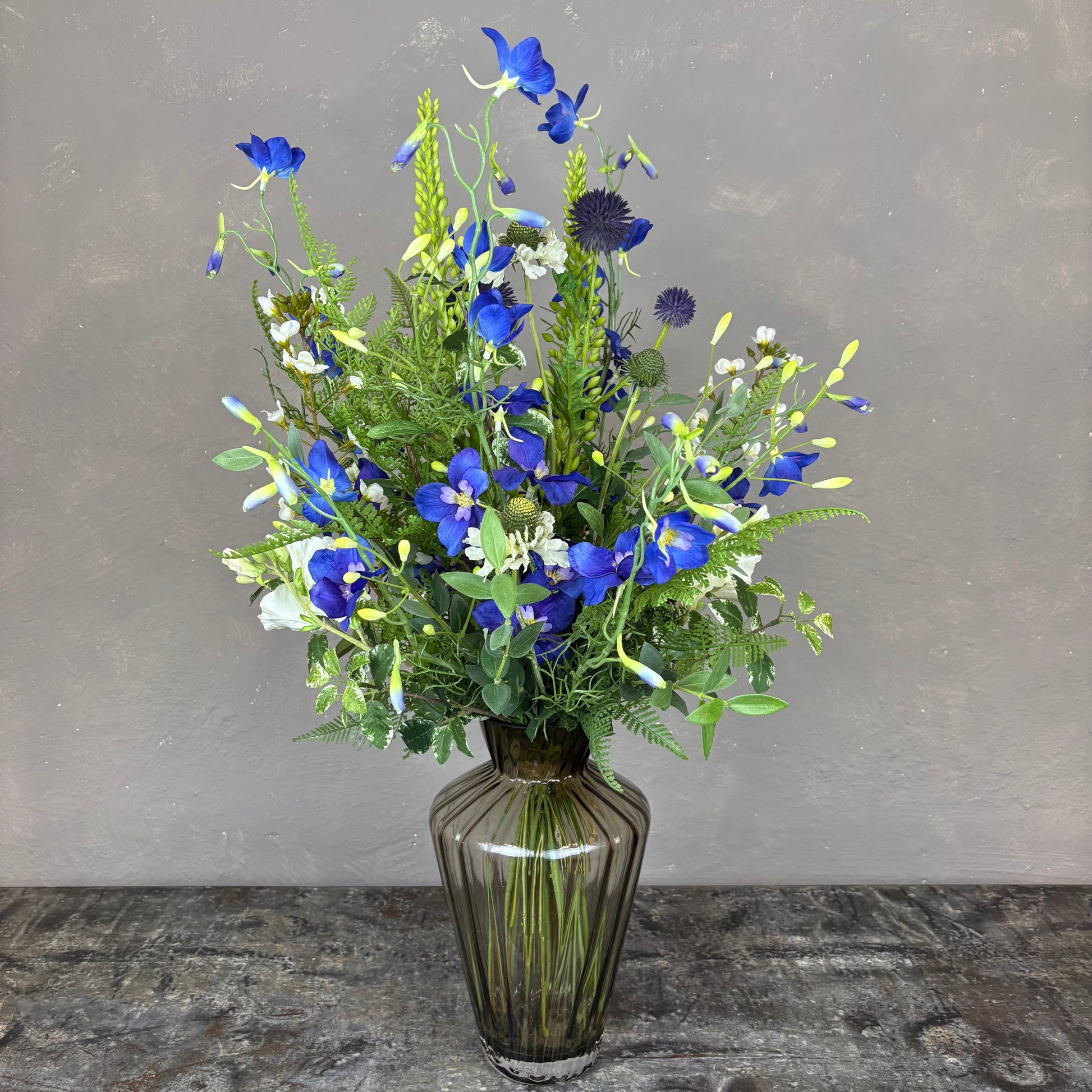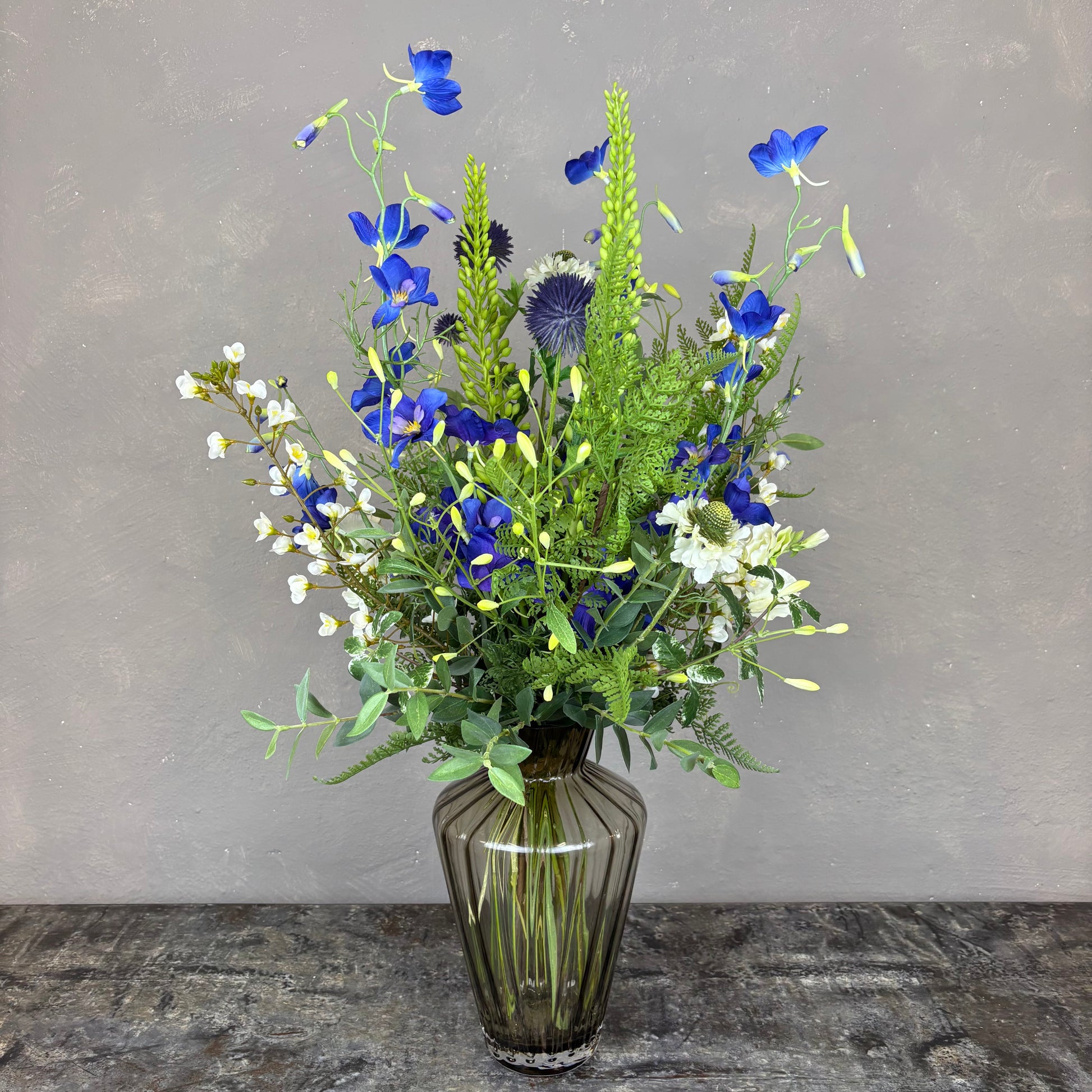 - Naturtro kunstig buket med bl.a. ridderspore, scabiosa og lathyrus