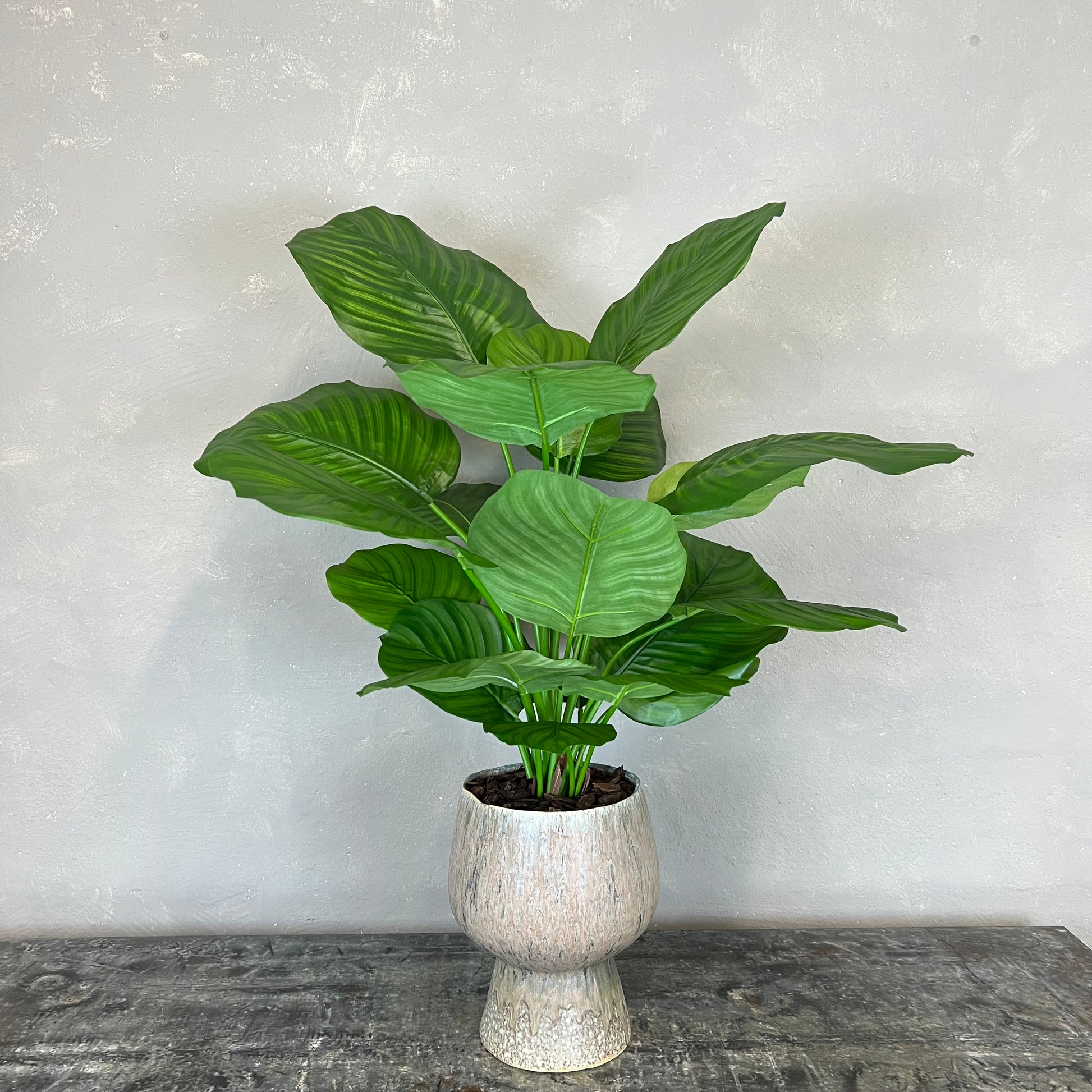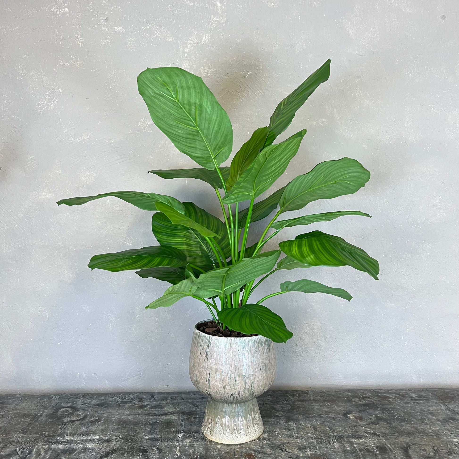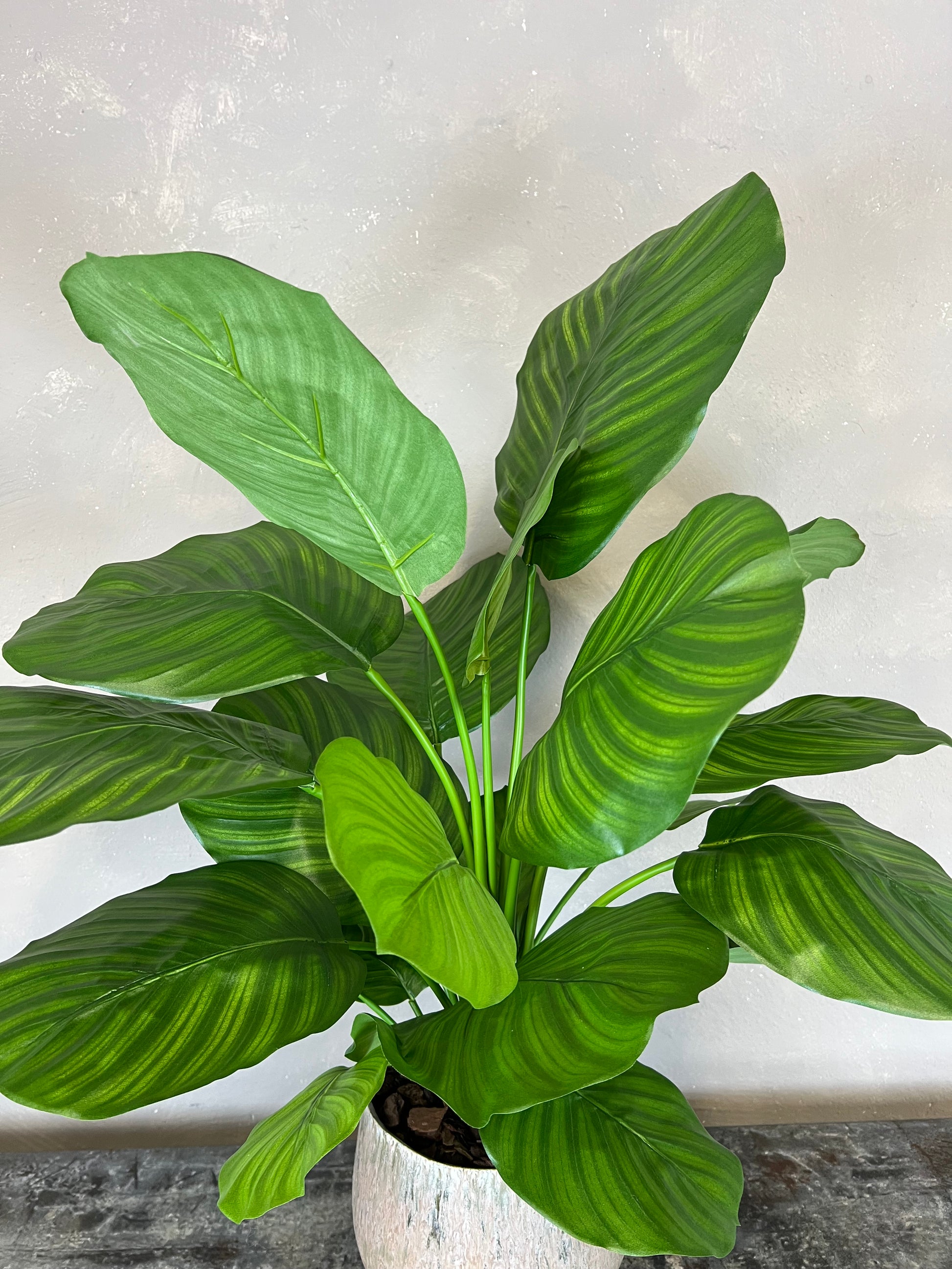 Calathea Fasciata har brede, ovale blade med tydelige striber i flere grønne nuancer. Bladene breder sig blødt ud fra midten og giver planten et frodigt og levende udtryk.