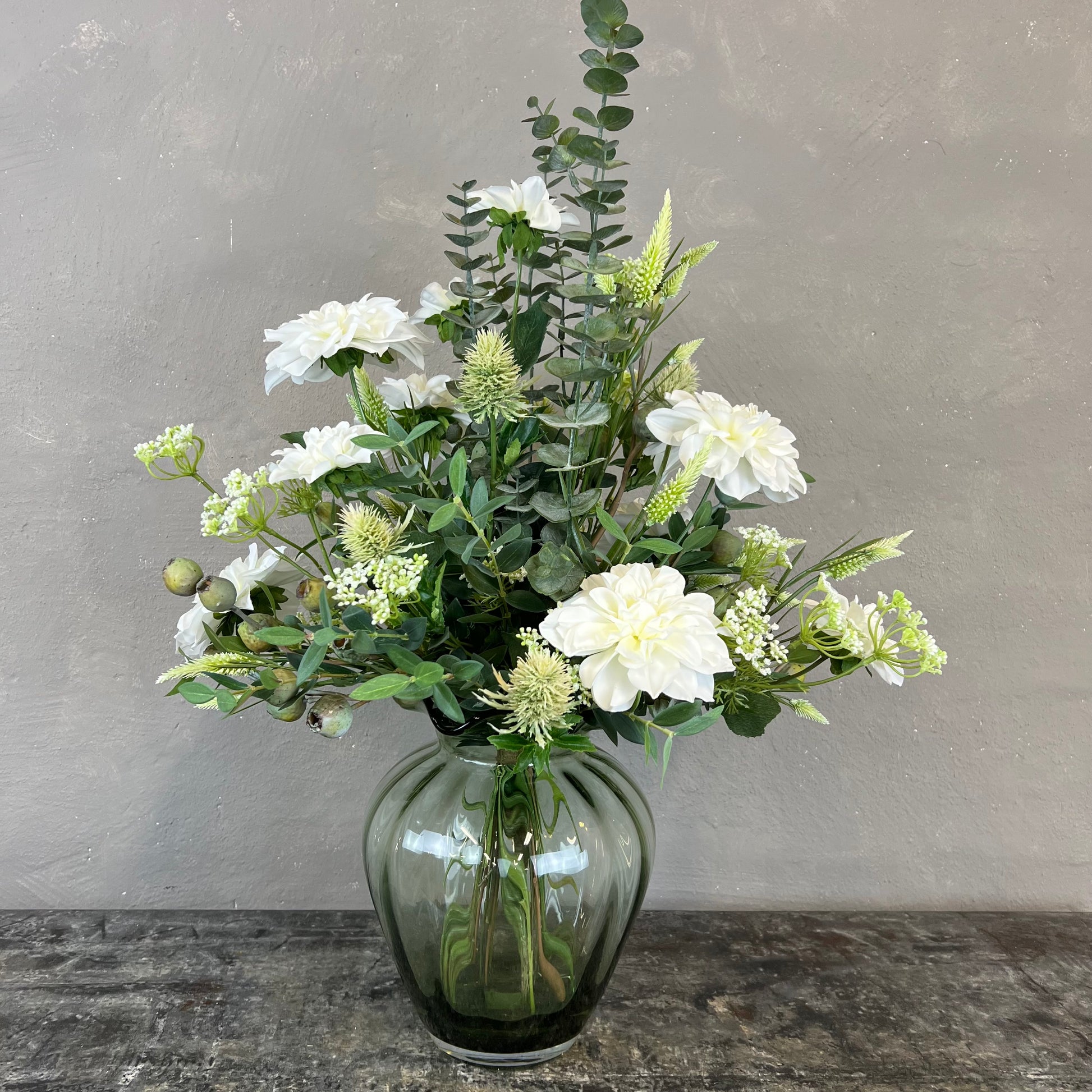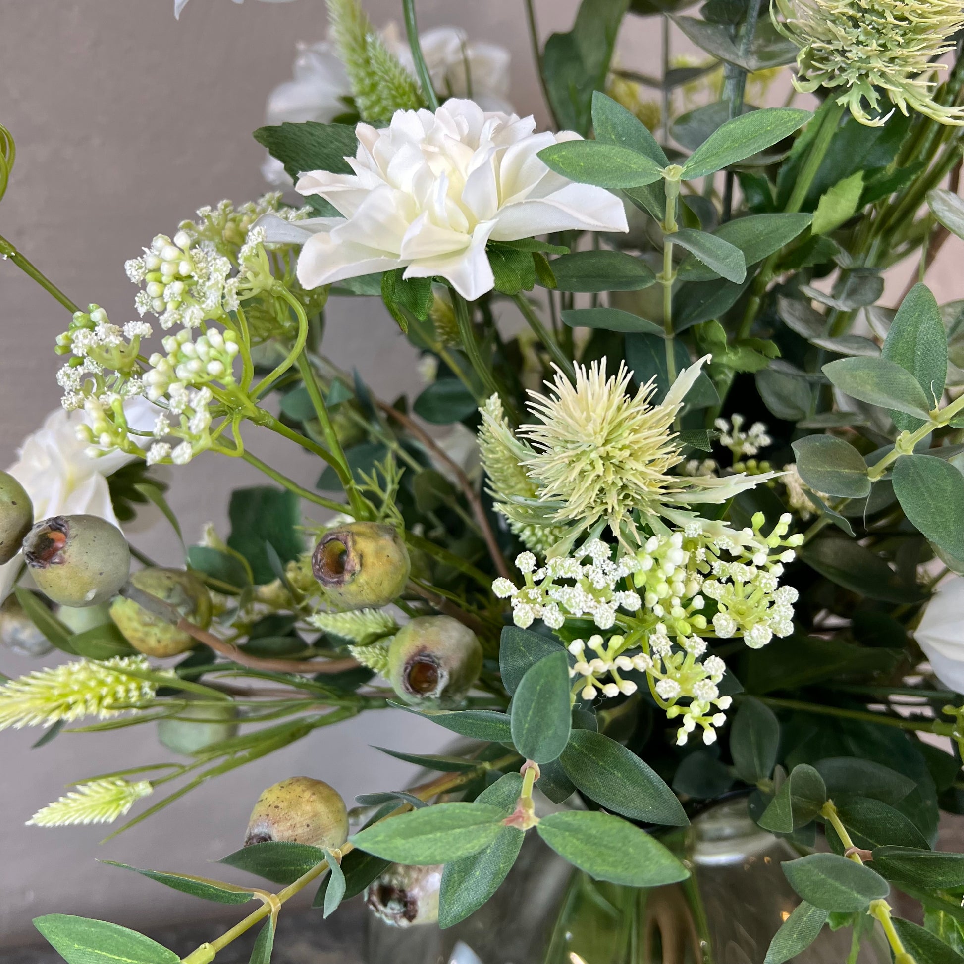 - Naturtro kunstig buket med dahlia, tidsler og kløver