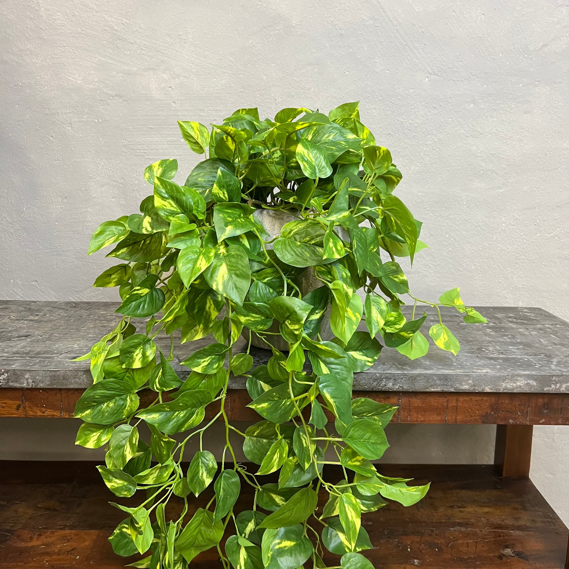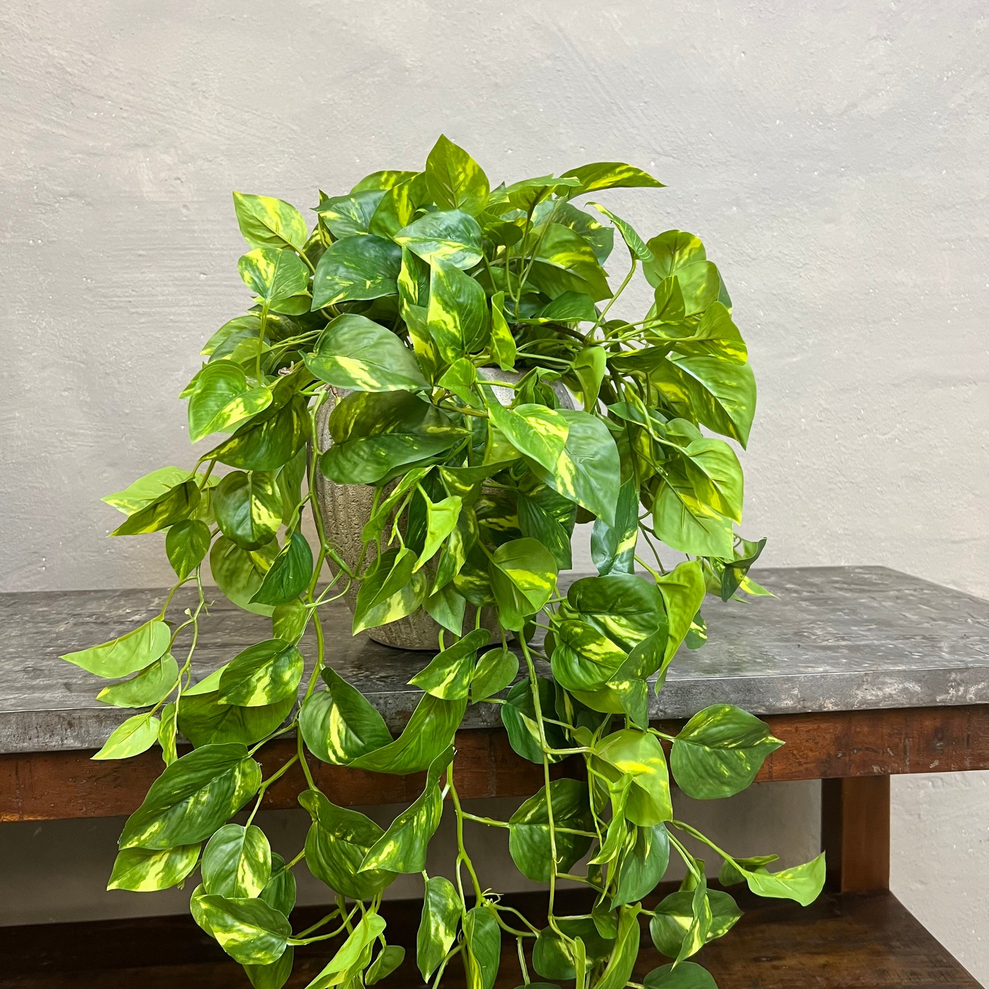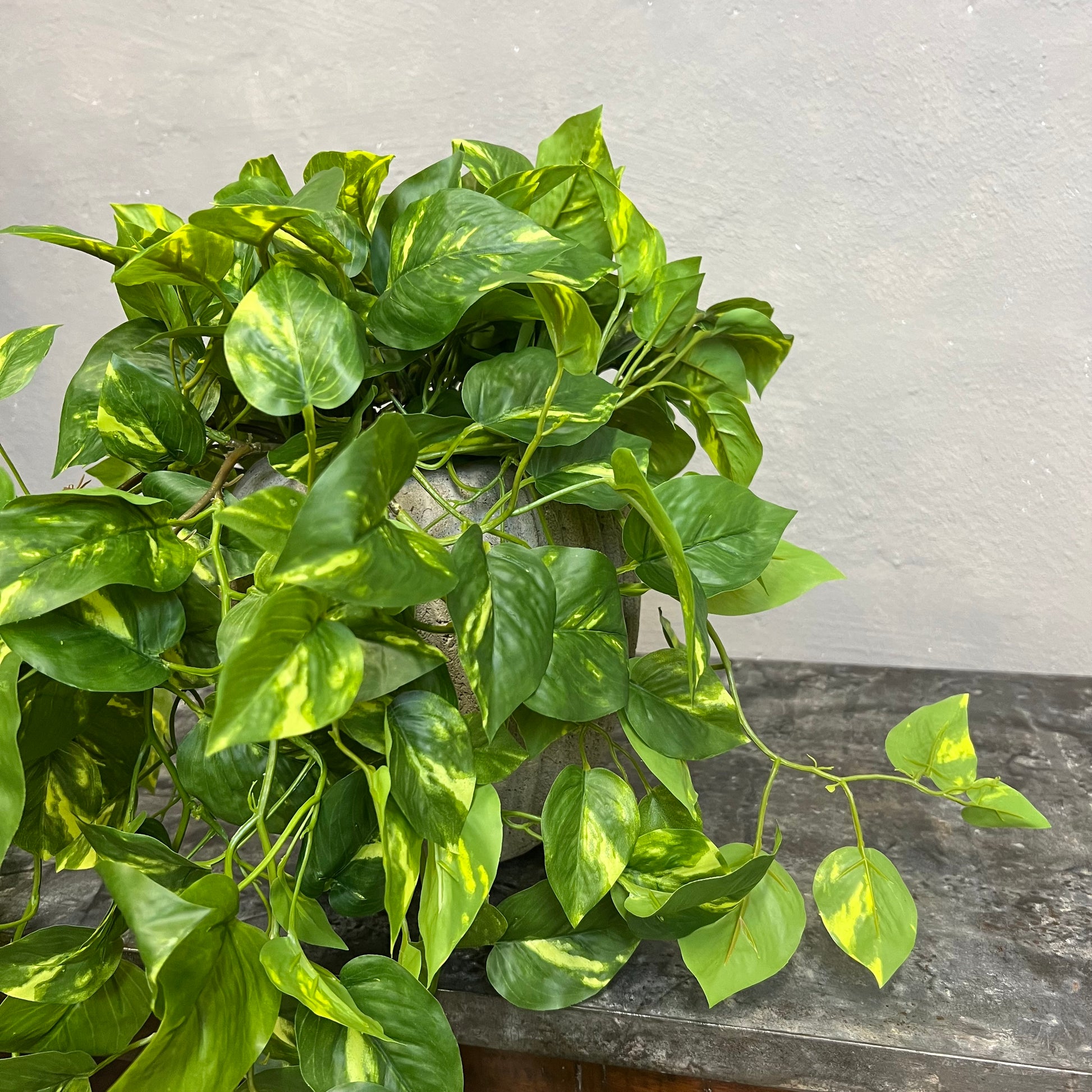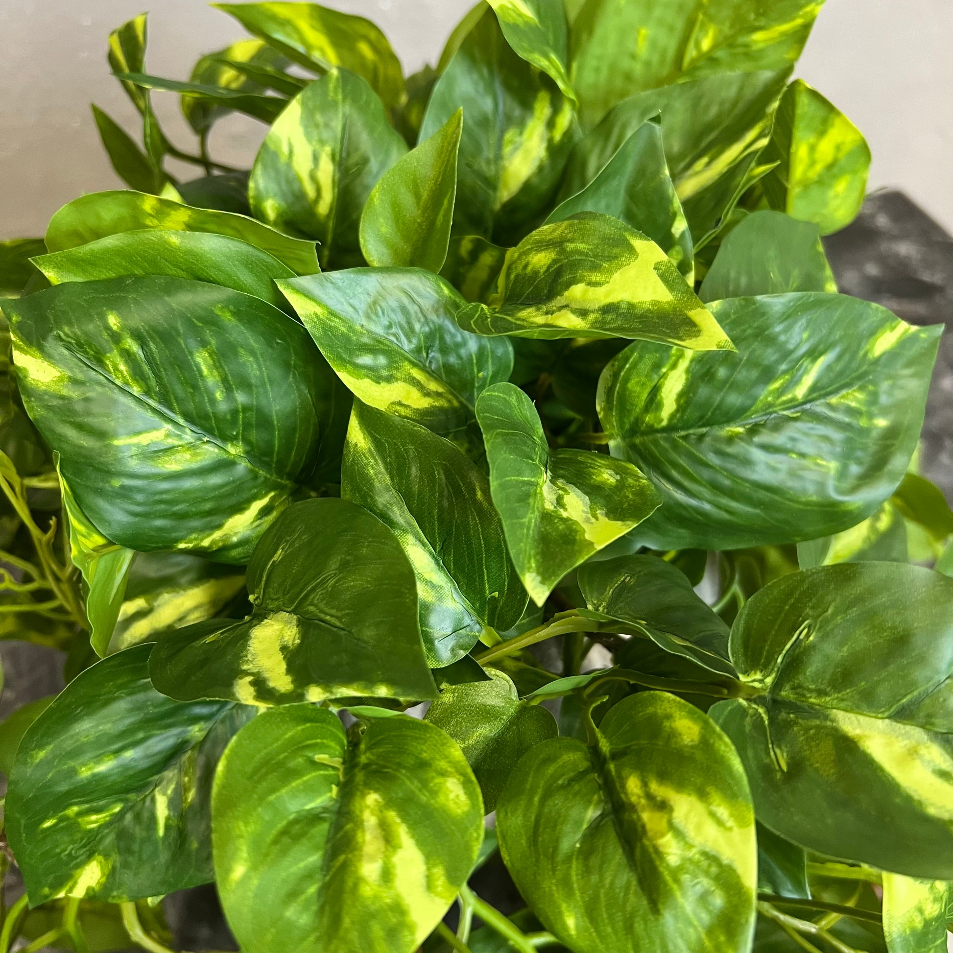 Denne kunstige guldranke har frodige, grønne blade med smukke lysegrønne og gule aftegninger, der giver et naturligt, tropisk udtryk. Den leveres i en sort plastpotte, så den er nem at placere i en pæn skjuler eller krukke efter eget valg.