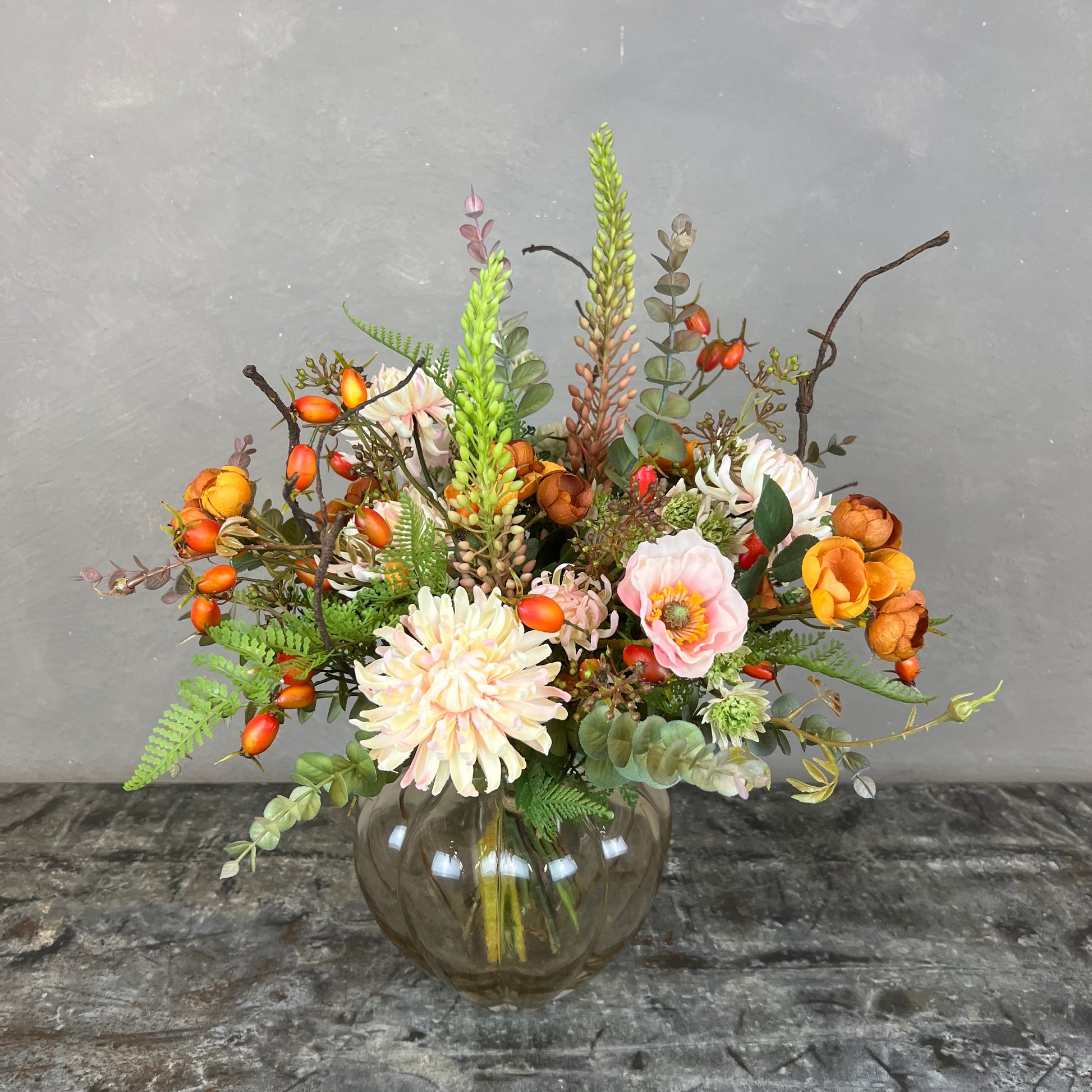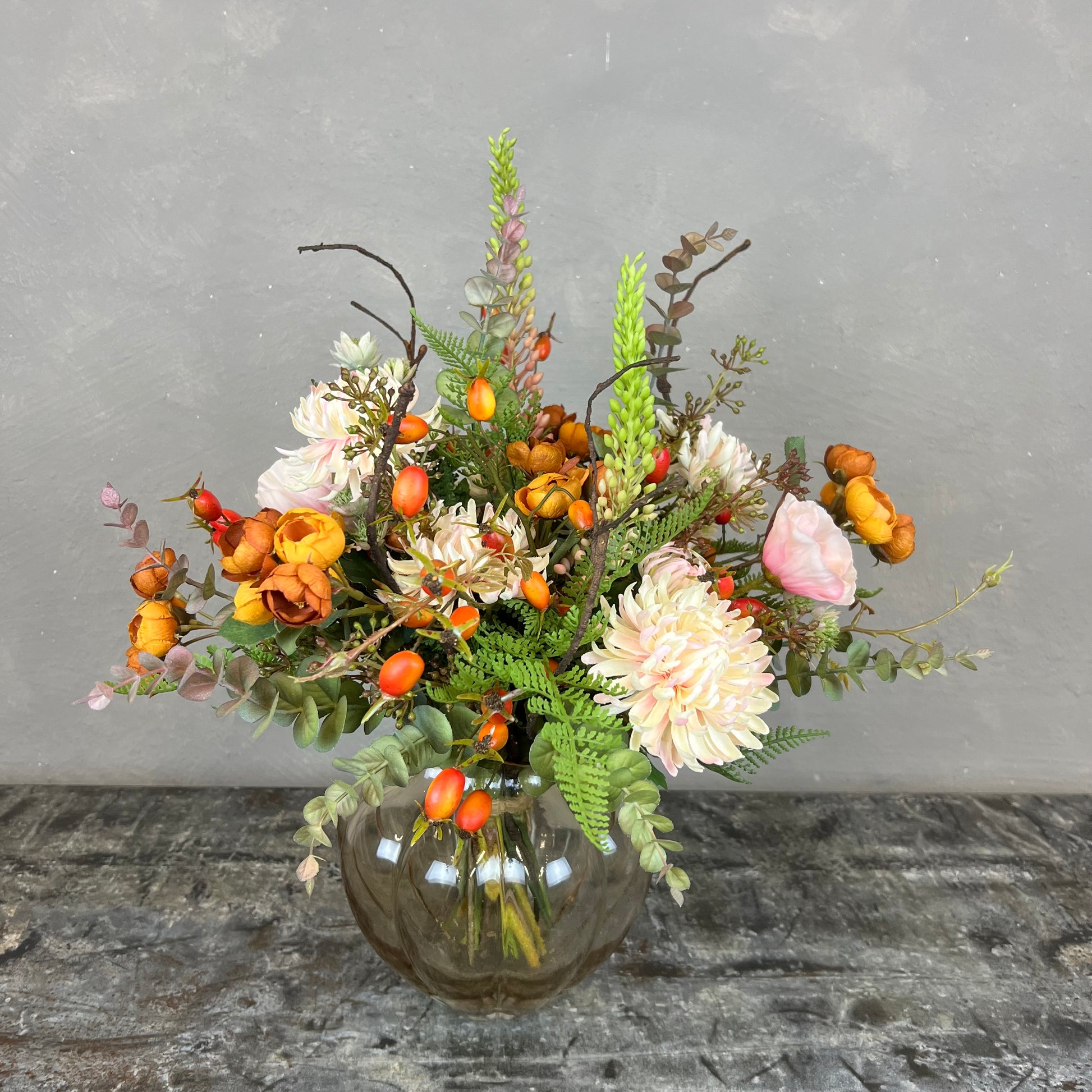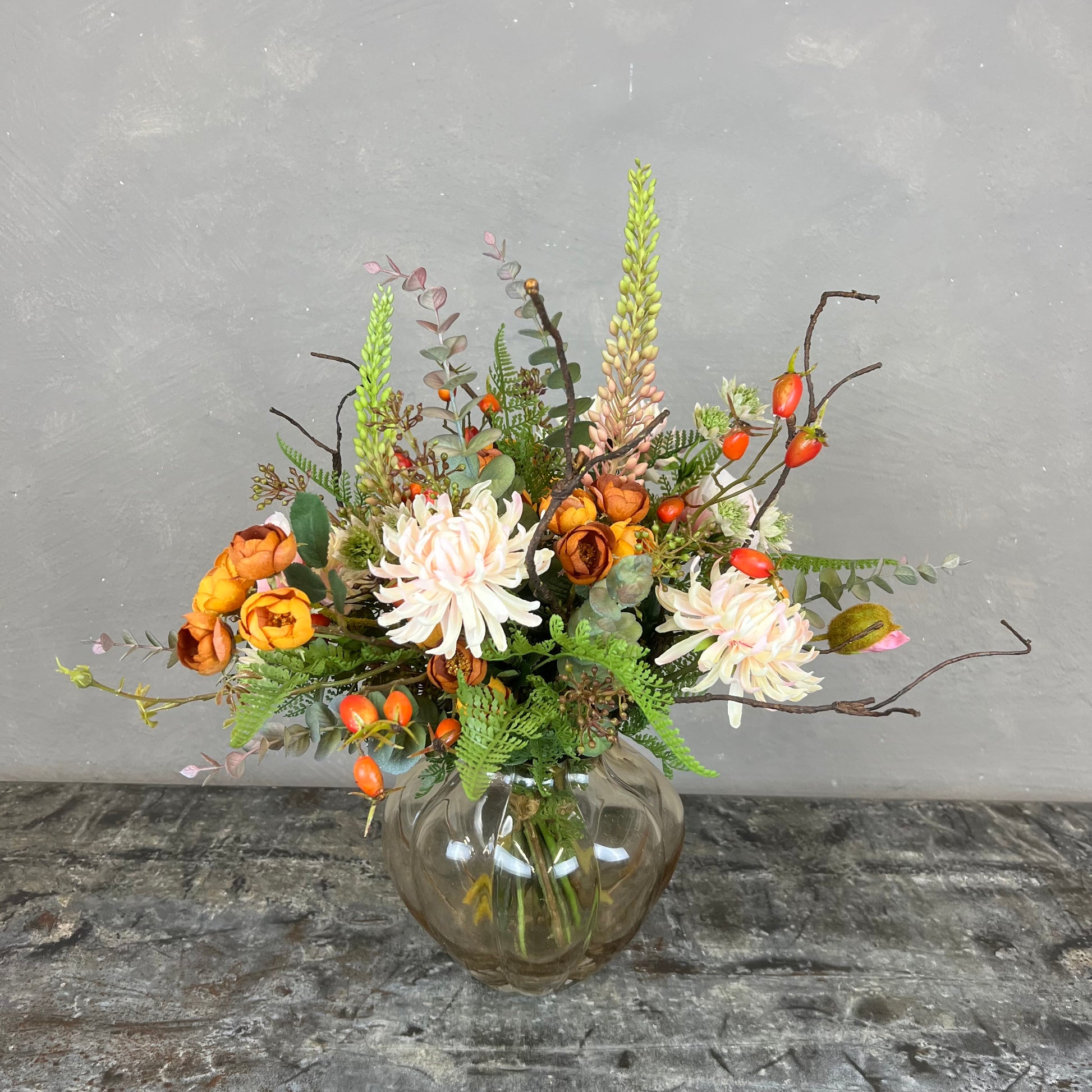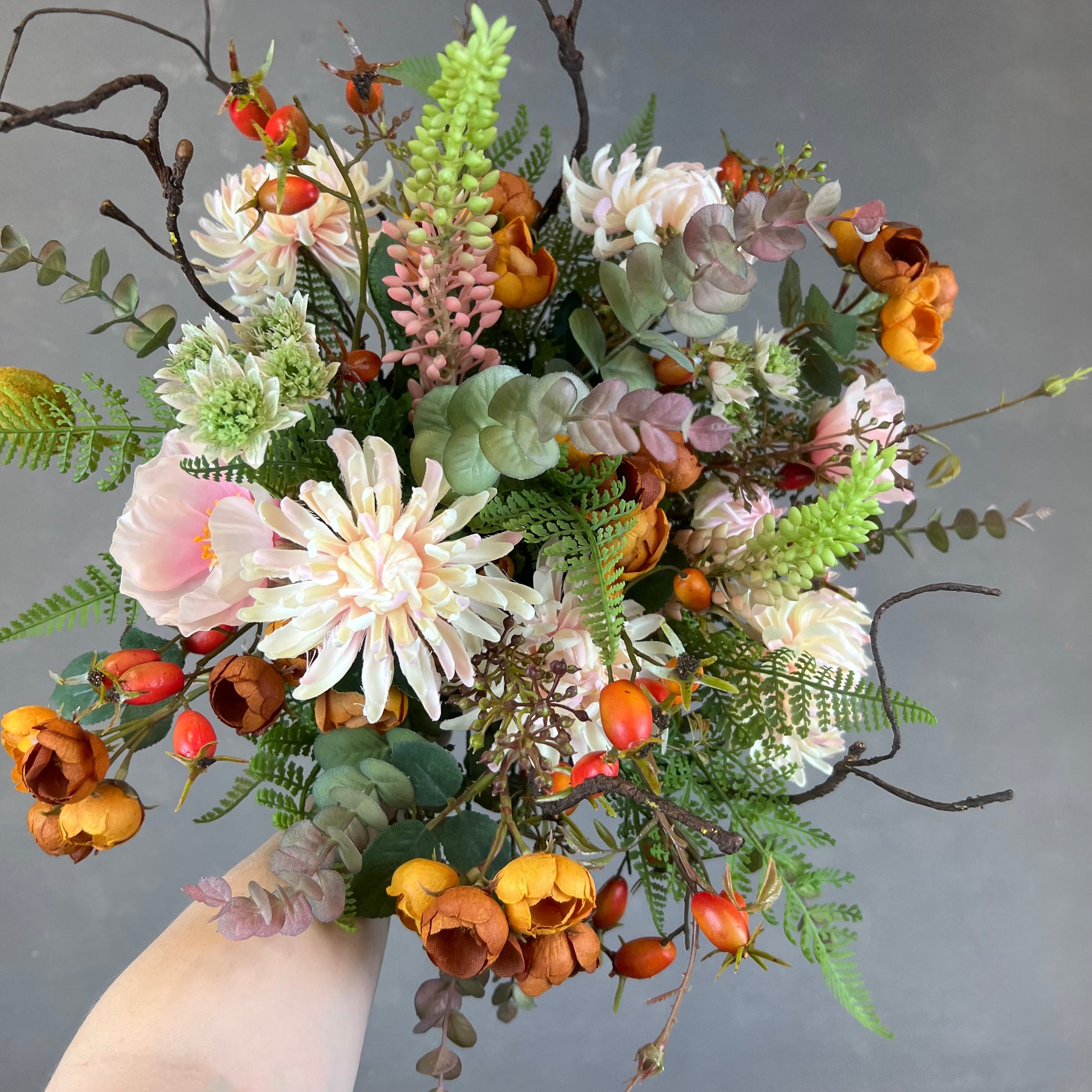- Naturtro kunstig buket med bl.a. chrysanthemum, hyben, valmue og rose.