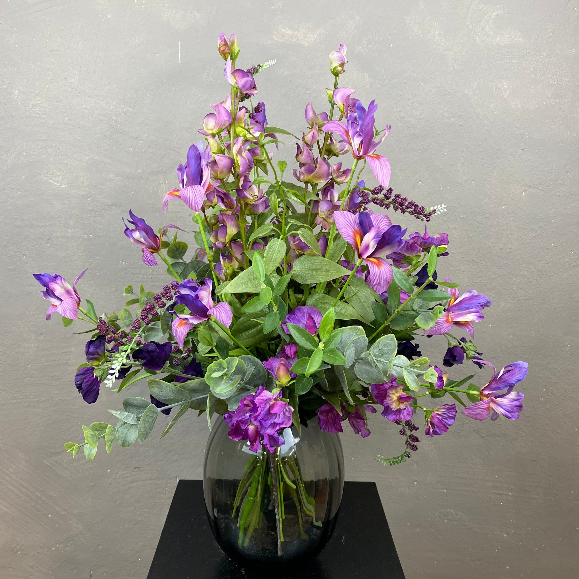 - Naturtro kunstig buket med bl.a. stormhat, iris, lavendel og lathyrus
