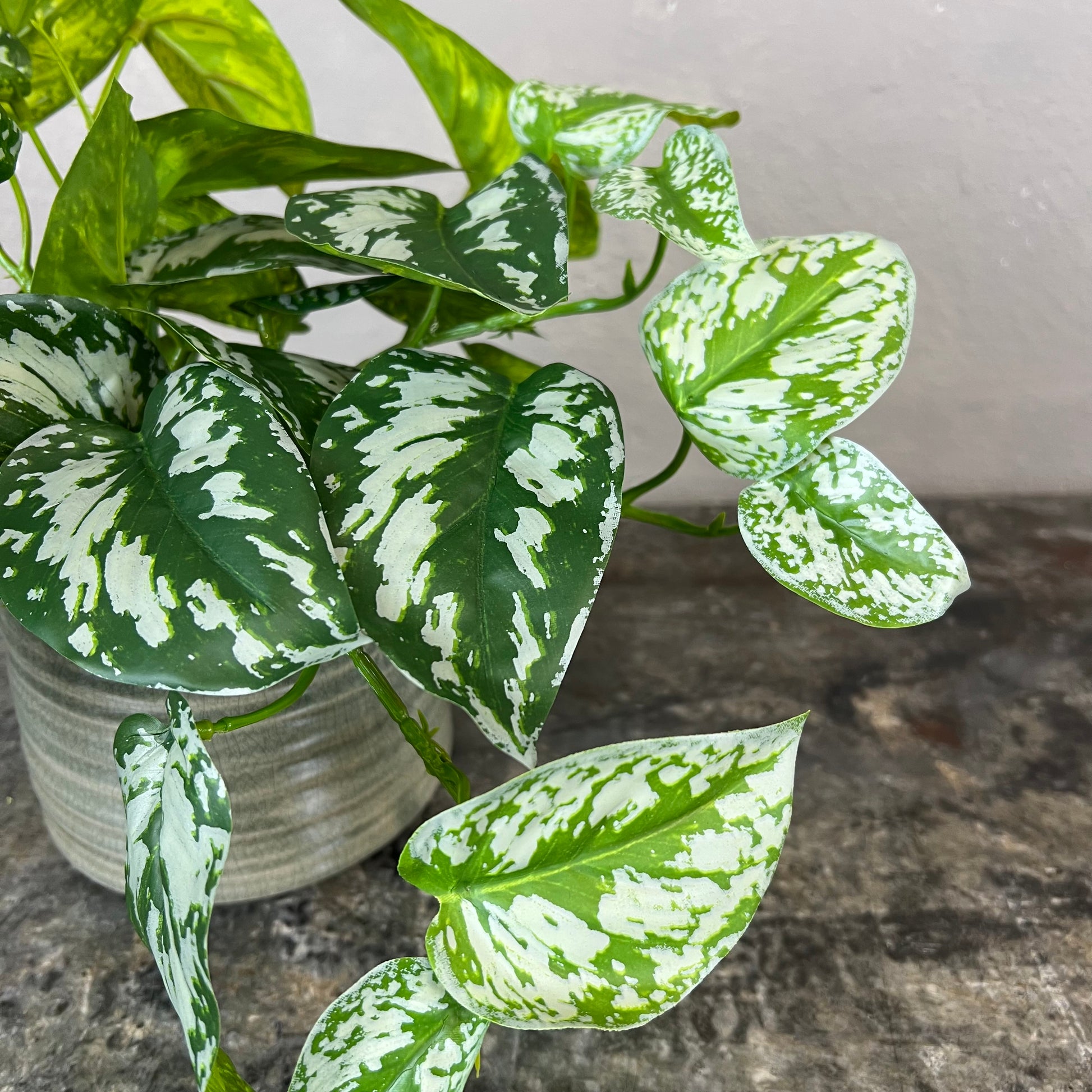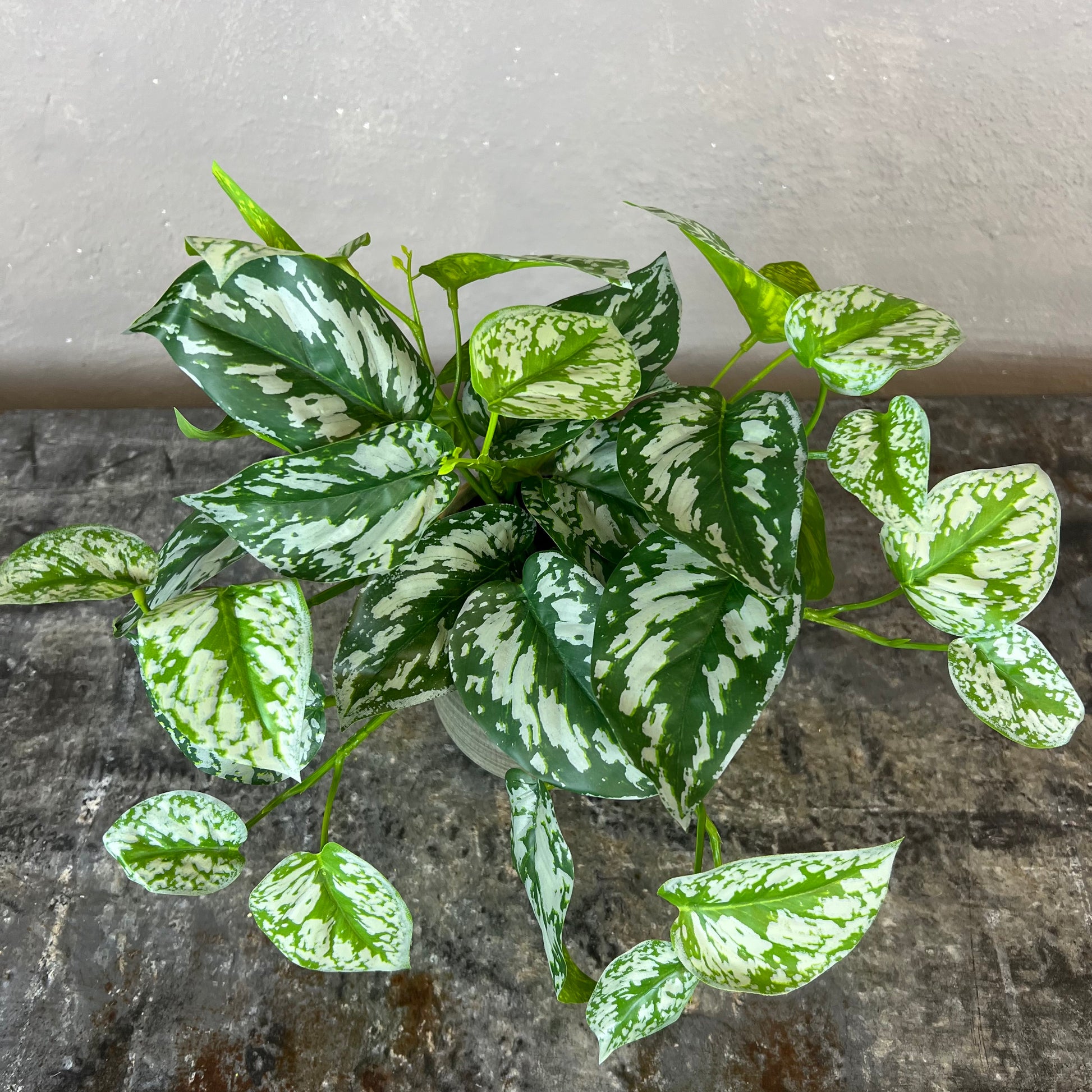 En naturtro sølvranke, der har fine grønne blade med sølvfarvede aftegninger.