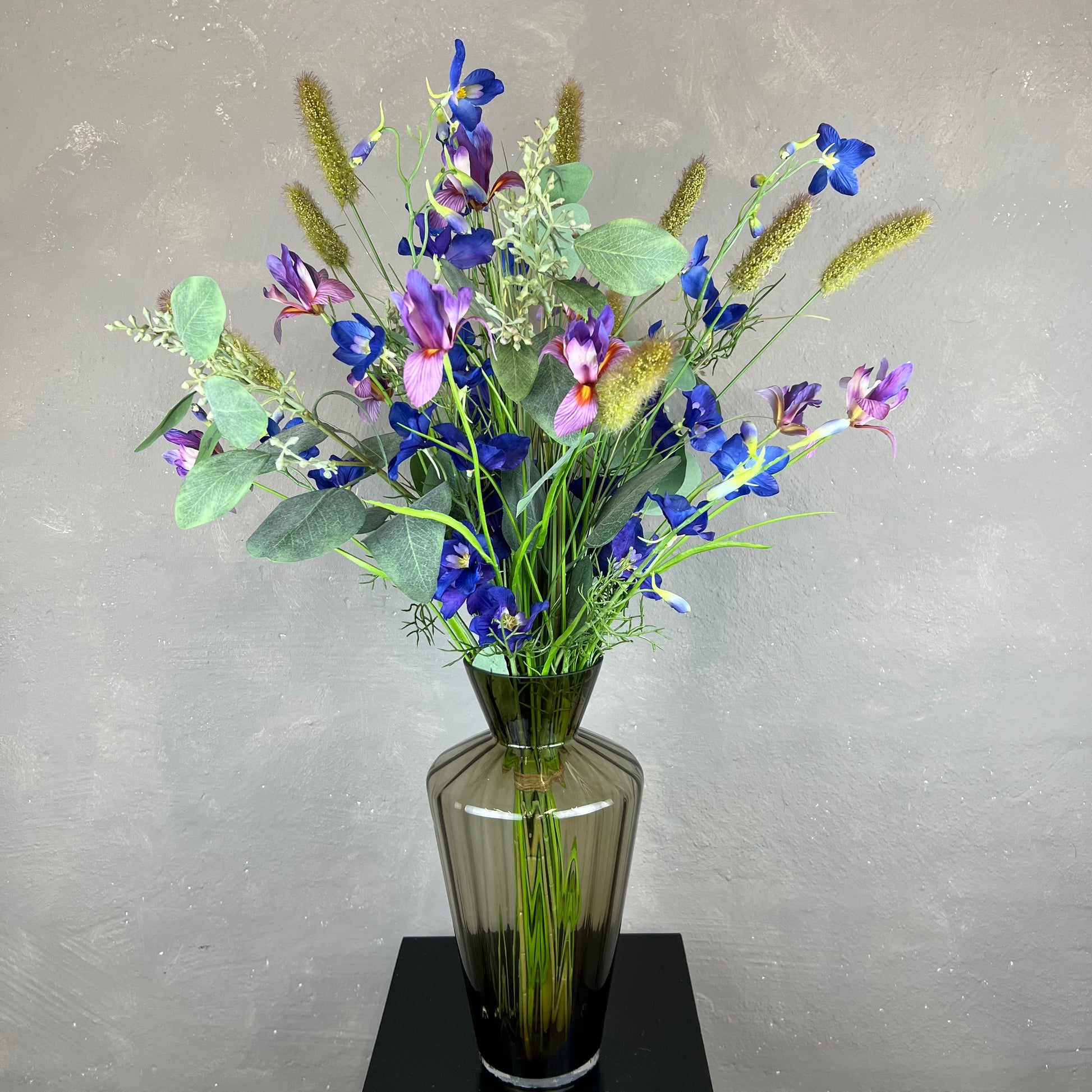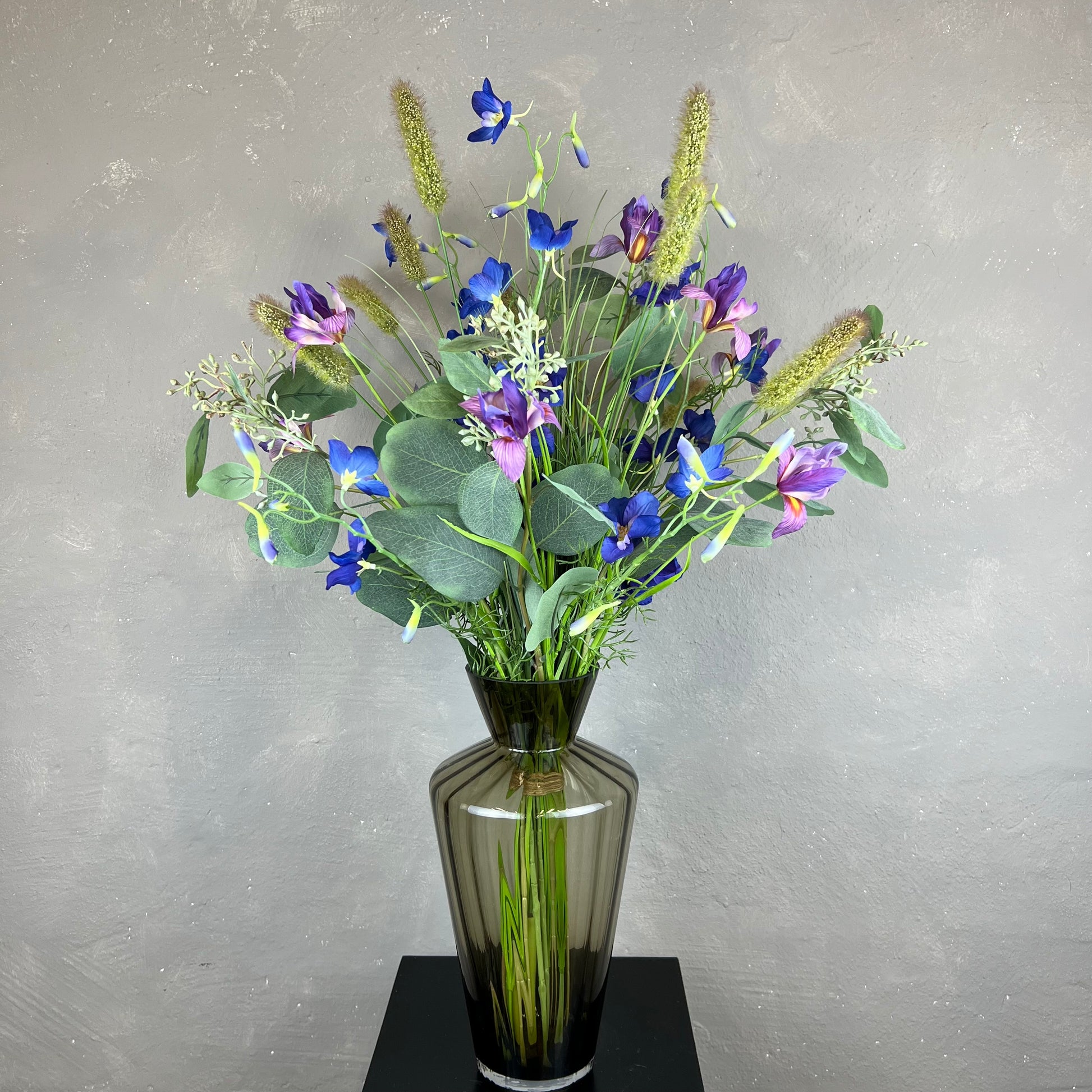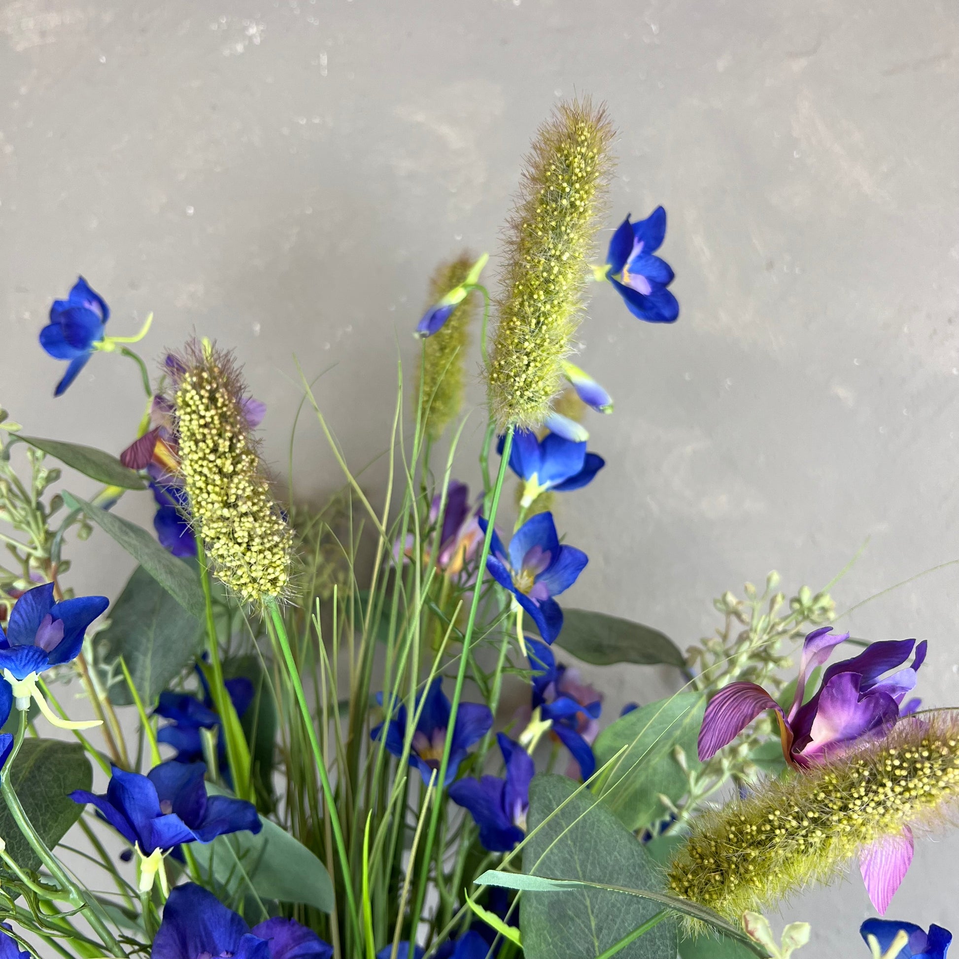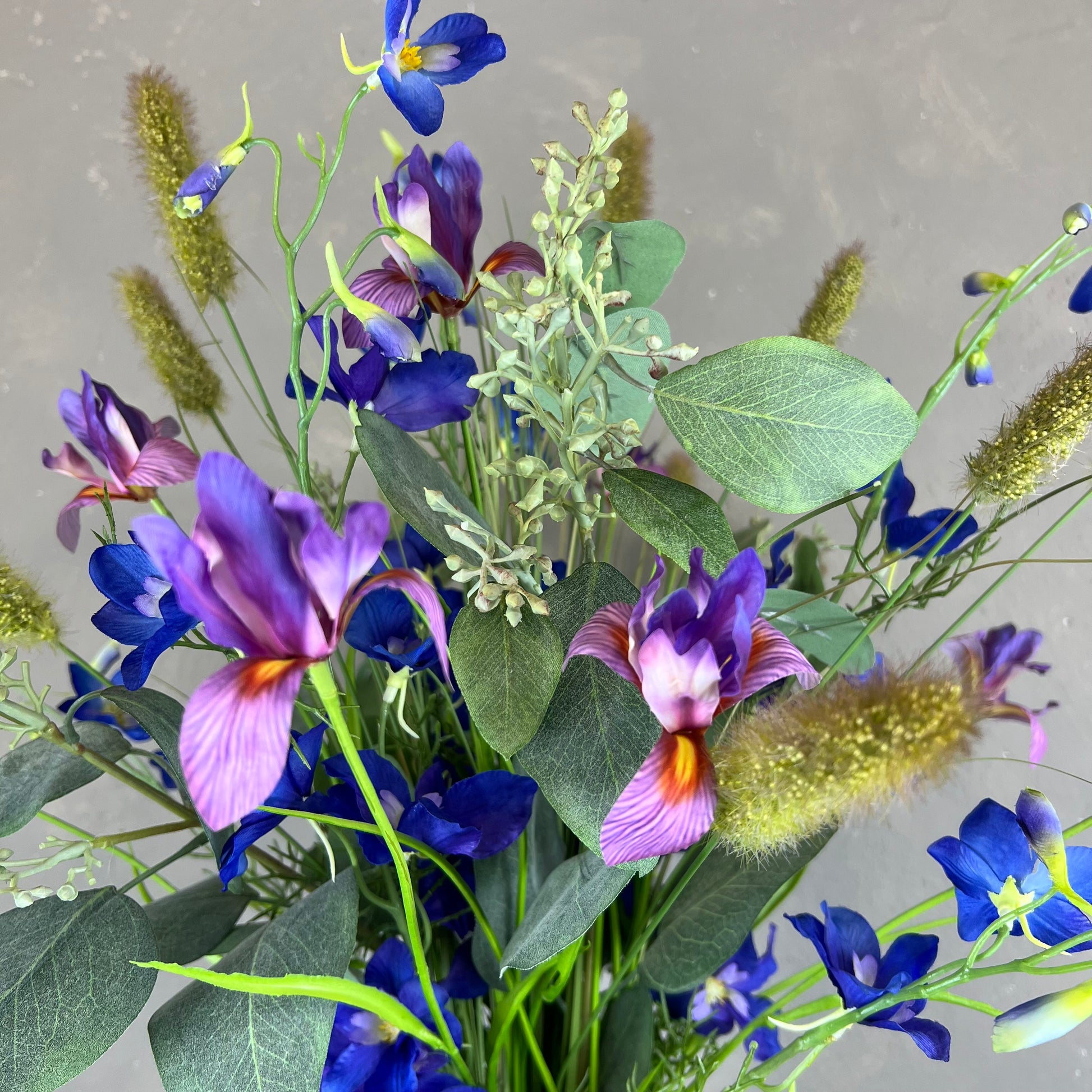 - Naturtro kunstig buket med blandt andet ridderspore og iris